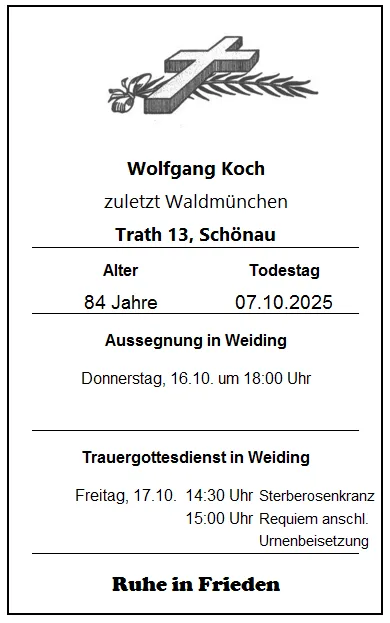 Am 12.10. ist deshalb kein Gottesdienst in Weiding. Den 10.00 Uhr Gottesdienst in Schönsee übernimmt Dekan Kaufmann.